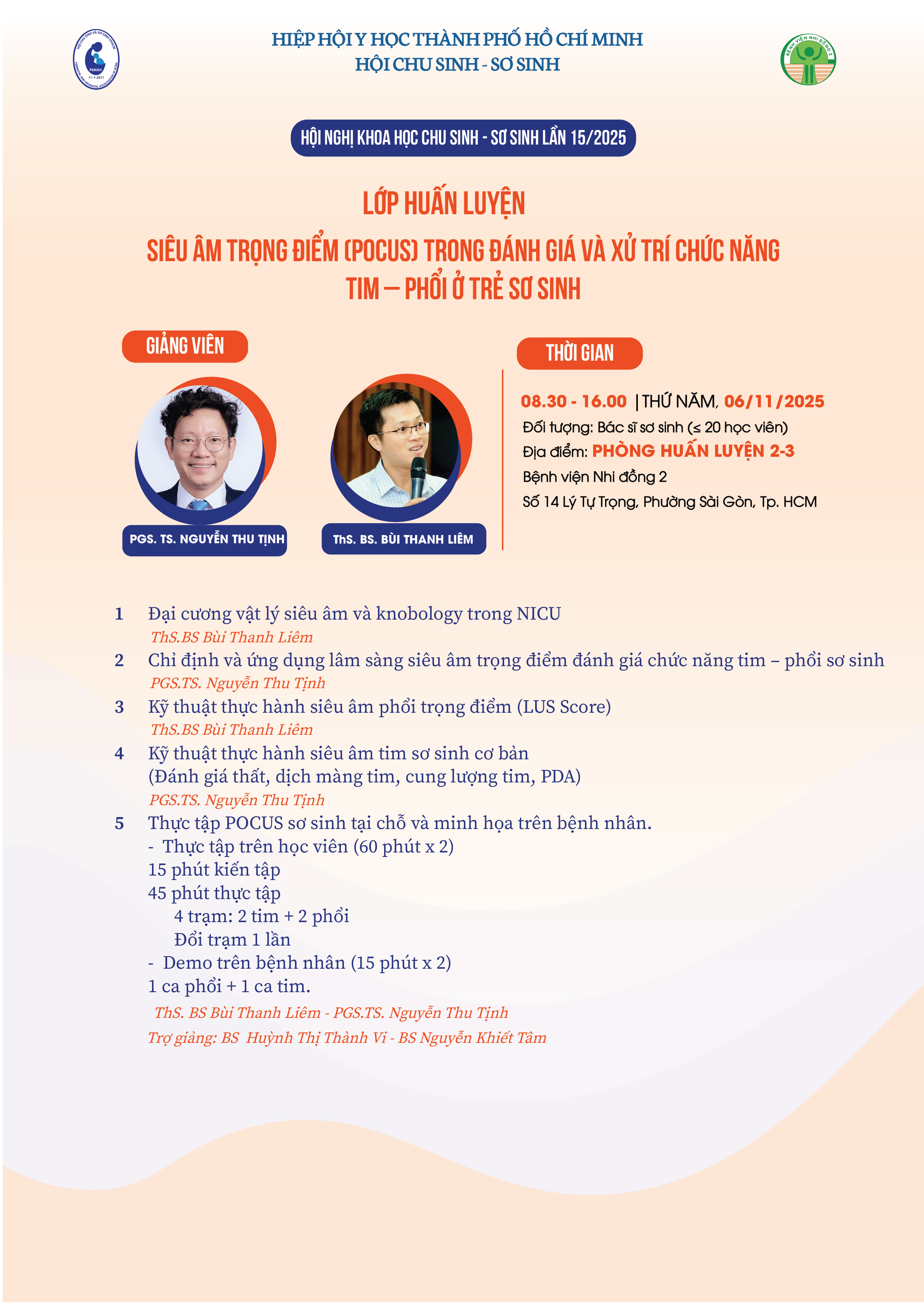 Trong khuôn khổ các hoạt động tiền Hội nghị khoa học Chu sinh – sơ sinh năm 2025, lớp huấn luyện chuyên đề Siêu âm trọng điểm trong đánh giá và xử trí chức năng tim – phổi ở trẻ sơ sinh được tổ chức ngày 6/11/10125. PGS.TS.BS Nguyễn Thu Tịnh và ThS.BS Bùi Thanh Liêm - hai giảng viên nhiều kinh nghiệm trong lĩnh vực hồi sức cấp cứu nhi – sơ sinh đên từ bộ môn Nhi, Đại học Y dược TP HCM, sẽ giới thiệu đến các bác sĩ chuyên khoa nhi – sơ sinh các kiến thức được cập nhập về siêu âm có trọng điểm - một công cụ lâm sàng được áp dụng để trả lời cho một câu hỏi cụ thể, thực tế, giúp các bác sĩ tiếp nhận được nhanh chóng các thông tin cần thiết, kịp thời đưa ra các biện pháp can thiệp và chăm sóc đặc biệt tại giường bệnh về các bệnh lý tim bẩm sinh, suy hô hấp... tiềm ẩn ở trẻ sơ sinh có nguy cơ, kịp thời đưa ra quyết định, đặc biệt trong quá trình xử trí cấp cứu bệnh nhi thay vì chờ đợi hoặc chỉ sử dụng kết quả từ các đơn vị xét nghiệm hoặc chẩn đoán hình ảnh để đánh giá lâm sàng